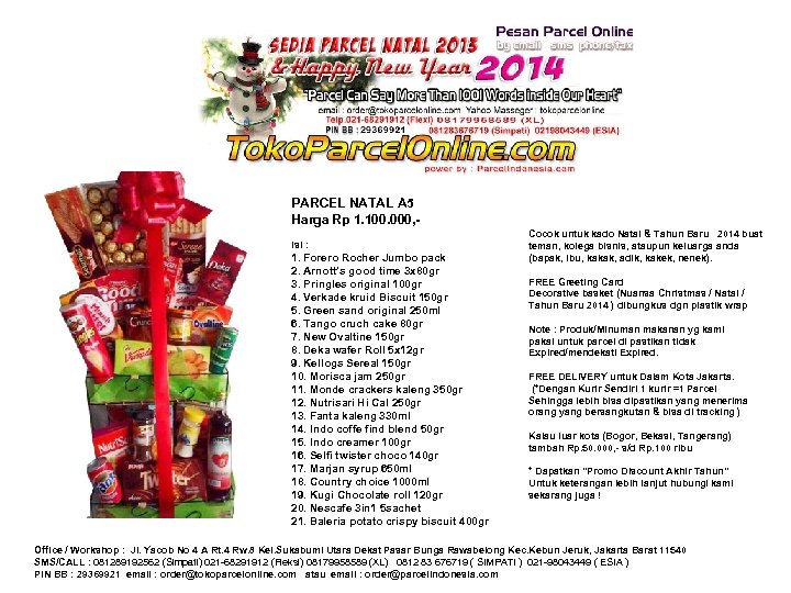 PARCEL NATAL A 5 Harga Rp 1. 100. 000, Isi : 1. Forero Rocher Jumbo pack 2. Arnott’s good time 3 x 80 gr 3. Pringles original 100 gr 4. Verkade kruid Biscuit 150 gr 5. Green sand original 250 ml 6. Tango cruch cake 80 gr 7. New Ovaltine 150 gr 8. Deka wafer Roll 5 x 12 gr 9. Kellogs Sereal 150 gr 10. Morisca jam 250 gr 11. Monde crackers kaleng 350 gr 12. Nutrisari Hi Cal 250 gr 13. Fanta kaleng 330 ml 14. Indo coffe find blend 50 gr 15. Indo creamer 100 gr 16. Selfi twister choco 140 gr 17. Marjan syrup 650 ml 18. Country choice 1000 ml 19. Kugi Chocolate roll 120 gr 20. Nescafe 3 in 1 5 sachet 21. Baleria potato crispy biscuit 400 gr Cocok untuk kado Natal & Tahun Baru 2014 buat teman, kolega bisnis, ataupun keluarga anda (bapak, ibu, kakak, adik, kakek, nenek). FREE Greeting Card Decorative basket (Nuansa Christmas / Natal / Tahun Baru 2014 ) dibungkus dgn plastik wrap Note : Produk/Minuman makanan yg kami pakai untuk parcel di pastikan tidak Expired/mendekati Expired. FREE DELIVERY untuk Dalam Kota Jakarta. (*Dengan Kurir Sendiri 1 kurir =1 Parcel Sehingga lebih bisa dipastikan yang menerima orang yang bersangkutan & bisa di tracking ) Kalau luar kota (Bogor, Bekasi, Tangerang) tambah Rp. 50. 000, - s/d Rp. 100 ribu * Dapatkan "Promo Discount Akhir Tahun" Untuk keterangan lebih lanjut hubungi kami sekarang juga ! Office / Workshop : Jl. Yacob No 4 A Rt. 4 Rw. 8 Kel. Sukabumi Utara Dekat Pasar Bunga Rawabelong Kec. Kebun Jeruk, Jakarta Barat 11540 SMS/CALL : 081289192562 (Simpati) 021 -68291912 (Fleksi) 08179958589 (XL) 0812 83 676719 ( SIMPATI ) 021 -98043449 ( ESIA ) PIN BB : 29369921 email : order@tokoparcelonline. com atau email : order@parcelindonesia. com