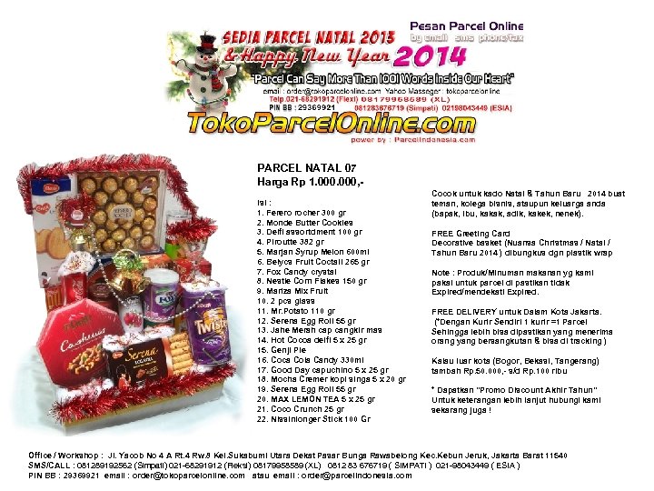PARCEL NATAL 07 Harga Rp 1. 000, Isi : 1. Ferero rocher 300 gr 2. Monde Butter Cookies 3. Delfi assortdment 100 gr 4. Piroutte 382 gr 5. Marjan Syrup Melon 600 ml 6. Belycs Fruit Coctail 265 gr 7. Fox Candy crystal 8. Nestle Corn Flakes 150 gr 9. Mariza Mix Fruit 10. 2 pcs glass 11. Mr. Potato 110 gr 12. Serena Egg Roll 55 gr 13. Jahe Merah cap cangkir mas 14. Hot Cocoa delfi 5 x 25 gr 15. Genji Pie 16. Coca Cola Candy 330 ml 17. Good Day capuchino 5 x 25 gr 18. Mocha Cremer kopi singa 5 x 20 gr 19. Serena Egg Roll 55 gr 20. MAX LEMON TEA 5 x 25 gr 21. Coco Crunch 25 gr 22. Nissinlonger Stick 100 Gr Cocok untuk kado Natal & Tahun Baru 2014 buat teman, kolega bisnis, ataupun keluarga anda (bapak, ibu, kakak, adik, kakek, nenek). FREE Greeting Card Decorative basket (Nuansa Christmas / Natal / Tahun Baru 2014 ) dibungkus dgn plastik wrap Note : Produk/Minuman makanan yg kami pakai untuk parcel di pastikan tidak Expired/mendekati Expired. FREE DELIVERY untuk Dalam Kota Jakarta. (*Dengan Kurir Sendiri 1 kurir =1 Parcel Sehingga lebih bisa dipastikan yang menerima orang yang bersangkutan & bisa di tracking ) Kalau luar kota (Bogor, Bekasi, Tangerang) tambah Rp. 50. 000, - s/d Rp. 100 ribu * Dapatkan "Promo Discount Akhir Tahun" Untuk keterangan lebih lanjut hubungi kami sekarang juga ! Office / Workshop : Jl. Yacob No 4 A Rt. 4 Rw. 8 Kel. Sukabumi Utara Dekat Pasar Bunga Rawabelong Kec. Kebun Jeruk, Jakarta Barat 11540 SMS/CALL : 081289192562 (Simpati) 021 -68291912 (Fleksi) 08179958589 (XL) 0812 83 676719 ( SIMPATI ) 021 -98043449 ( ESIA ) PIN BB : 29369921 email : order@tokoparcelonline. com atau email : order@parcelindonesia. com