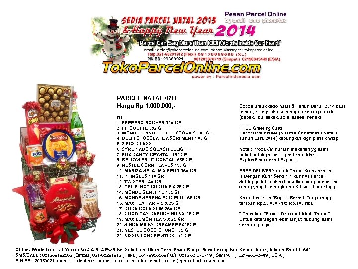 PARCEL NATAL 07 B Harga Rp 1. 000, Isi : 1. FERRERO ROCHER 300 GR 2. PIROUUTTE 382 GR 3. WONDERLAND BUTTER COOKIES 300 GR 4. DELFI CHOCOLATE ASORTMENT 100 GR 5. 2 PCS GLASS 6. SYRUP ABC SQUASH DELIGHT 7. FOX CANDY CRYSTAL 180 GR 8. BELCYS FRUIT COKTAIL 565 GR 9. NESTLE CORN FLAKES 150 GR 10. MARIZA SELAI MIX FRUIT 350 GR 11. PRINGLES 110 GR 12. TWISTER 140 GR 13. DEL FI HOT COCOA 5 X 25 GR 14. MONDE GENJI PIE 105 GR 15. MONDE SERENA EGG ROOL 55 GR 16. MAX TEA TARIK 5 X 25 GR 17. COCA COLA SLIM 250 GR 18. GOOD DAY CAPUCHINO 5 X 25 GR 19. MAX LEMON TEA 5 X 25 GR 20. SINGA MILKY CREAMER 5 X 25 GR 21. NESTLE COCO CRUNCH 35 GR 22. NISSIN LONGER STICK 100 GR Cocok untuk kado Natal & Tahun Baru 2014 buat teman, kolega bisnis, ataupun keluarga anda (bapak, ibu, kakak, adik, kakek, nenek). FREE Greeting Card Decorative basket (Nuansa Christmas / Natal / Tahun Baru 2014 ) dibungkus dgn plastik wrap Note : Produk/Minuman makanan yg kami pakai untuk parcel di pastikan tidak Expired/mendekati Expired. FREE DELIVERY untuk Dalam Kota Jakarta. (*Dengan Kurir Sendiri 1 kurir =1 Parcel Sehingga lebih bisa dipastikan yang menerima orang yang bersangkutan & bisa di tracking ) Kalau luar kota (Bogor, Bekasi, Tangerang) tambah Rp. 50. 000, - s/d Rp. 100 ribu * Dapatkan "Promo Discount Akhir Tahun" Untuk keterangan lebih lanjut hubungi kami sekarang juga ! Office / Workshop : Jl. Yacob No 4 A Rt. 4 Rw. 8 Kel. Sukabumi Utara Dekat Pasar Bunga Rawabelong Kec. Kebun Jeruk, Jakarta Barat 11540 SMS/CALL : 081289192562 (Simpati) 021 -68291912 (Fleksi) 08179958589 (XL) 0812 83 676719 ( SIMPATI ) 021 -98043449 ( ESIA ) PIN BB : 29369921 email : order@tokoparcelonline. com atau email : order@parcelindonesia. com