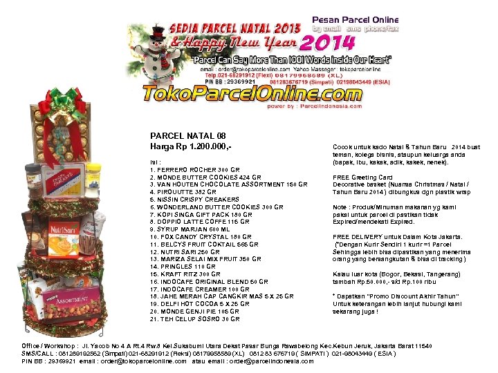 PARCEL NATAL 08 Harga Rp 1. 200. 000, Isi : 1. FERRERO ROCHER 300 GR 2. MONDE BUTTER COOKIES 424 GR 3. VAN HOUTEN CHOCOLATE ASSORTMENT 150 GR 4. PIROUUTTE 382 GR 5. NISSIN CRISPY CREAKERS 6. WONDERLAND BUTTER COOKIES 300 GR 7. KOPI SINGA GIFT PACK 180 GR 8. DOPPIO LATTE COFFE 115 GR 9. SYRUP MARJAN 600 ML 10. FOX CANDY CRYSTAL 180 GR 11. BELCYS FRUIT COKTAIL 565 GR 12. NUTRI SARI 250 GR 13. MARIZA SELAI MIX FRUIT 350 GR 14. PRINGLES 110 GR 15. KRAFT RITZ 300 GR 16. INDOCAFE ORIGINAL BLEND 50 GR 17. INDOCAFE CREAMER 100 GR 18. JAHE MERAH CAP CANGKIR MAS 5 X 25 GR 19. DELFI HOT COCOA 5 X 25 GR 20. MONDE GENJI PIE 105 GR 21. TEH CELUP SOSRO 30 GR Cocok untuk kado Natal & Tahun Baru 2014 buat teman, kolega bisnis, ataupun keluarga anda (bapak, ibu, kakak, adik, kakek, nenek). FREE Greeting Card Decorative basket (Nuansa Christmas / Natal / Tahun Baru 2014 ) dibungkus dgn plastik wrap Note : Produk/Minuman makanan yg kami pakai untuk parcel di pastikan tidak Expired/mendekati Expired. FREE DELIVERY untuk Dalam Kota Jakarta. (*Dengan Kurir Sendiri 1 kurir =1 Parcel Sehingga lebih bisa dipastikan yang menerima orang yang bersangkutan & bisa di tracking ) Kalau luar kota (Bogor, Bekasi, Tangerang) tambah Rp. 50. 000, - s/d Rp. 100 ribu * Dapatkan "Promo Discount Akhir Tahun" Untuk keterangan lebih lanjut hubungi kami sekarang juga ! Office / Workshop : Jl. Yacob No 4 A Rt. 4 Rw. 8 Kel. Sukabumi Utara Dekat Pasar Bunga Rawabelong Kec. Kebun Jeruk, Jakarta Barat 11540 SMS/CALL : 081289192562 (Simpati) 021 -68291912 (Fleksi) 08179958589 (XL) 0812 83 676719 ( SIMPATI ) 021 -98043449 ( ESIA ) PIN BB : 29369921 email : order@tokoparcelonline. com atau email : order@parcelindonesia. com