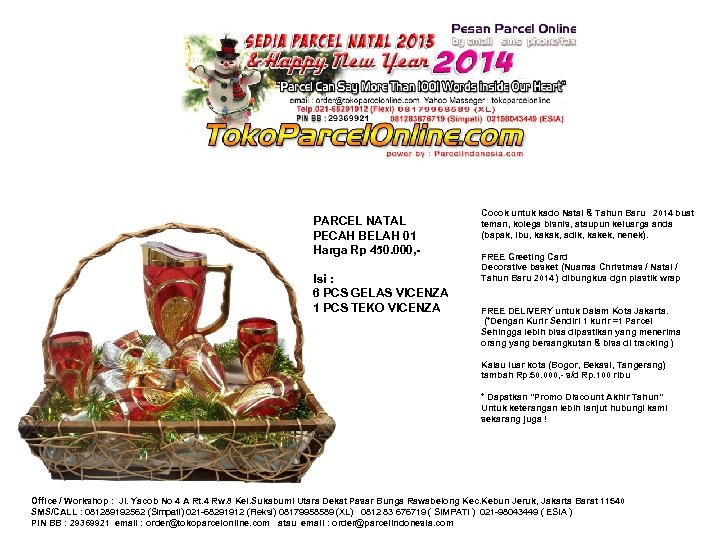 PARCEL NATAL PECAH BELAH 01 Harga Rp 450. 000, Isi : 6 PCS GELAS VICENZA 1 PCS TEKO VICENZA Cocok untuk kado Natal & Tahun Baru 2014 buat teman, kolega bisnis, ataupun keluarga anda (bapak, ibu, kakak, adik, kakek, nenek). FREE Greeting Card Decorative basket (Nuansa Christmas / Natal / Tahun Baru 2014 ) dibungkus dgn plastik wrap FREE DELIVERY untuk Dalam Kota Jakarta. (*Dengan Kurir Sendiri 1 kurir =1 Parcel Sehingga lebih bisa dipastikan yang menerima orang yang bersangkutan & bisa di tracking ) Kalau luar kota (Bogor, Bekasi, Tangerang) tambah Rp. 50. 000, - s/d Rp. 100 ribu * Dapatkan "Promo Discount Akhir Tahun" Untuk keterangan lebih lanjut hubungi kami sekarang juga ! Office / Workshop : Jl. Yacob No 4 A Rt. 4 Rw. 8 Kel. Sukabumi Utara Dekat Pasar Bunga Rawabelong Kec. Kebun Jeruk, Jakarta Barat 11540 SMS/CALL : 081289192562 (Simpati) 021 -68291912 (Fleksi) 08179958589 (XL) 0812 83 676719 ( SIMPATI ) 021 -98043449 ( ESIA ) PIN BB : 29369921 email : order@tokoparcelonline. com atau email : order@parcelindonesia. com