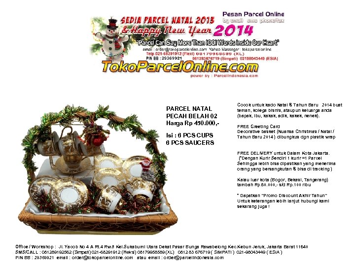 PARCEL NATAL PECAH BELAH 02 Harga Rp 450. 000, Isi : 6 PCS CUPS 6 PCS SAUCERS Cocok untuk kado Natal & Tahun Baru 2014 buat teman, kolega bisnis, ataupun keluarga anda (bapak, ibu, kakak, adik, kakek, nenek). FREE Greeting Card Decorative basket (Nuansa Christmas / Natal / Tahun Baru 2014 ) dibungkus dgn plastik wrap FREE DELIVERY untuk Dalam Kota Jakarta. (*Dengan Kurir Sendiri 1 kurir =1 Parcel Sehingga lebih bisa dipastikan yang menerima orang yang bersangkutan & bisa di tracking ) Kalau luar kota (Bogor, Bekasi, Tangerang) tambah Rp. 50. 000, - s/d Rp. 100 ribu * Dapatkan "Promo Discount Akhir Tahun" Untuk keterangan lebih lanjut hubungi kami sekarang juga ! Office / Workshop : Jl. Yacob No 4 A Rt. 4 Rw. 8 Kel. Sukabumi Utara Dekat Pasar Bunga Rawabelong Kec. Kebun Jeruk, Jakarta Barat 11540 SMS/CALL : 081289192562 (Simpati) 021 -68291912 (Fleksi) 08179958589 (XL) 0812 83 676719 ( SIMPATI ) 021 -98043449 ( ESIA ) PIN BB : 29369921 email : order@tokoparcelonline. com atau email : order@parcelindonesia. com