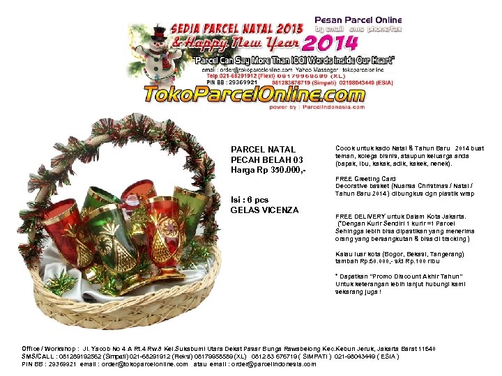 PARCEL NATAL PECAH BELAH 03 Harga Rp 350. 000, Isi : 6 pcs GELAS VICENZA Cocok untuk kado Natal & Tahun Baru 2014 buat teman, kolega bisnis, ataupun keluarga anda (bapak, ibu, kakak, adik, kakek, nenek). FREE Greeting Card Decorative basket (Nuansa Christmas / Natal / Tahun Baru 2014 ) dibungkus dgn plastik wrap FREE DELIVERY untuk Dalam Kota Jakarta. (*Dengan Kurir Sendiri 1 kurir =1 Parcel Sehingga lebih bisa dipastikan yang menerima orang yang bersangkutan & bisa di tracking ) Kalau luar kota (Bogor, Bekasi, Tangerang) tambah Rp. 50. 000, - s/d Rp. 100 ribu * Dapatkan "Promo Discount Akhir Tahun" Untuk keterangan lebih lanjut hubungi kami sekarang juga ! Office / Workshop : Jl. Yacob No 4 A Rt. 4 Rw. 8 Kel. Sukabumi Utara Dekat Pasar Bunga Rawabelong Kec. Kebun Jeruk, Jakarta Barat 11540 SMS/CALL : 081289192562 (Simpati) 021 -68291912 (Fleksi) 08179958589 (XL) 0812 83 676719 ( SIMPATI ) 021 -98043449 ( ESIA ) PIN BB : 29369921 email : order@tokoparcelonline. com atau email : order@parcelindonesia. com