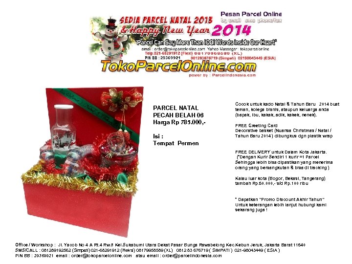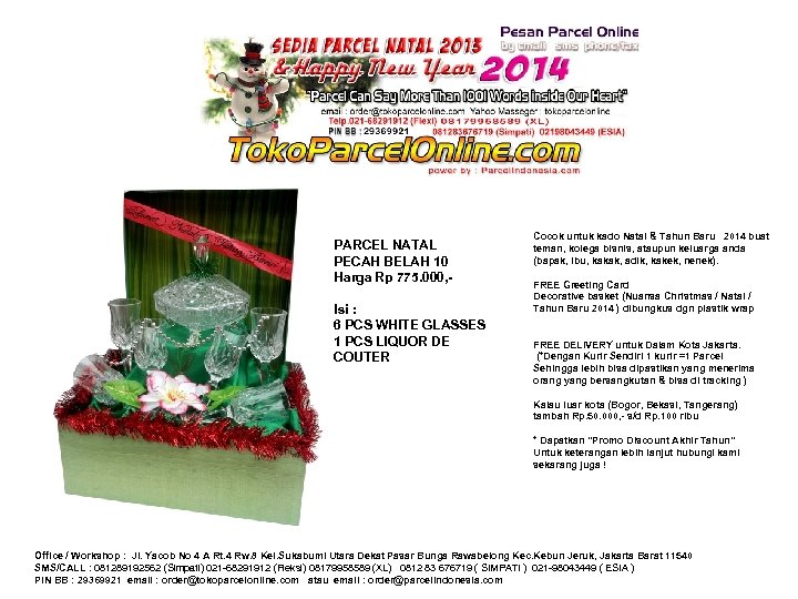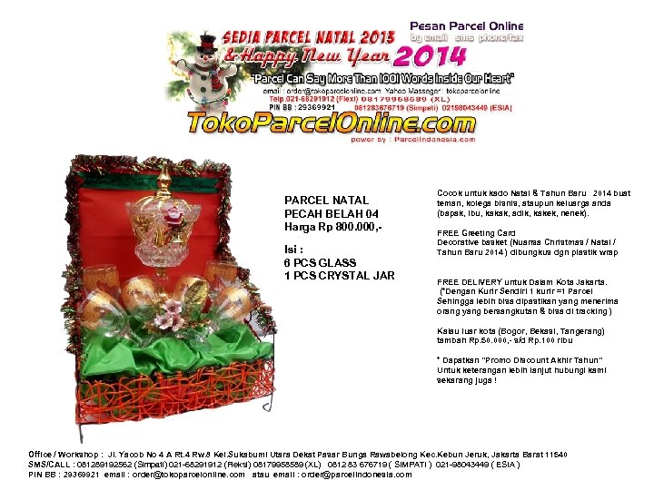 PARCEL NATAL PECAH BELAH 04 Harga Rp 800. 000, Isi : 6 PCS GLASS 1 PCS CRYSTAL JAR Cocok untuk kado Natal & Tahun Baru 2014 buat teman, kolega bisnis, ataupun keluarga anda (bapak, ibu, kakak, adik, kakek, nenek). FREE Greeting Card Decorative basket (Nuansa Christmas / Natal / Tahun Baru 2014 ) dibungkus dgn plastik wrap FREE DELIVERY untuk Dalam Kota Jakarta. (*Dengan Kurir Sendiri 1 kurir =1 Parcel Sehingga lebih bisa dipastikan yang menerima orang yang bersangkutan & bisa di tracking ) Kalau luar kota (Bogor, Bekasi, Tangerang) tambah Rp. 50. 000, - s/d Rp. 100 ribu * Dapatkan "Promo Discount Akhir Tahun" Untuk keterangan lebih lanjut hubungi kami sekarang juga ! Office / Workshop : Jl. Yacob No 4 A Rt. 4 Rw. 8 Kel. Sukabumi Utara Dekat Pasar Bunga Rawabelong Kec. Kebun Jeruk, Jakarta Barat 11540 SMS/CALL : 081289192562 (Simpati) 021 -68291912 (Fleksi) 08179958589 (XL) 0812 83 676719 ( SIMPATI ) 021 -98043449 ( ESIA ) PIN BB : 29369921 email : order@tokoparcelonline. com atau email : order@parcelindonesia. com