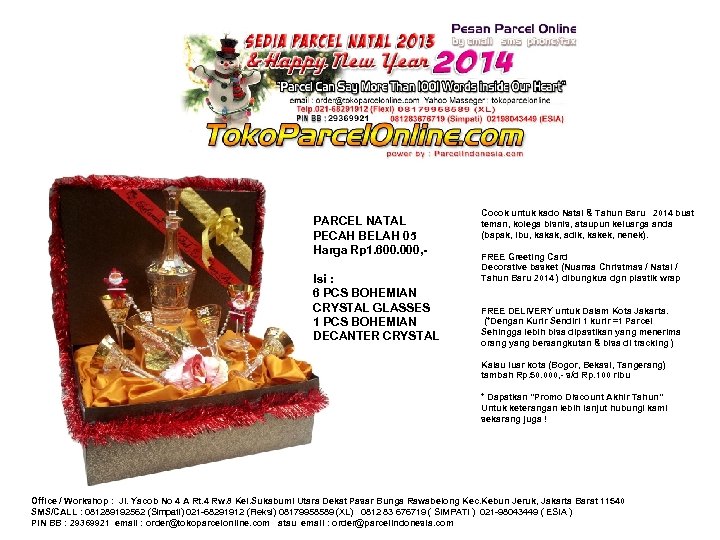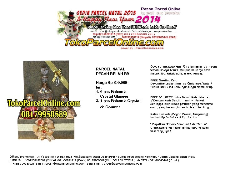 PARCEL NATAL PECAH BELAH B 9 Harga Rp 800. 000 Isi : 1. 6 pcs Bohemia Crystal Glasses 2. 1 pcs Bohemia Crystal de Counter Cocok untuk kado Natal & Tahun Baru 2014 buat teman, kolega bisnis, ataupun keluarga anda (bapak, ibu, kakak, adik, kakek, nenek). FREE Greeting Card Decorative basket (Nuansa Christmas / Natal / Tahun Baru 2014 ) dibungkus dgn plastik wrap FREE DELIVERY untuk Dalam Kota Jakarta. (*Dengan Kurir Sendiri 1 kurir =1 Parcel Sehingga lebih bisa dipastikan yang menerima orang yang bersangkutan & bisa di tracking ) Kalau luar kota (Bogor, Bekasi, Tangerang) tambah Rp. 50. 000, - s/d Rp. 100 ribu * Dapatkan "Promo Discount Akhir Tahun" Untuk keterangan lebih lanjut hubungi kami sekarang juga ! Office / Workshop : Jl. Yacob No 4 A Rt. 4 Rw. 8 Kel. Sukabumi Utara Dekat Pasar Bunga Rawabelong Kec. Kebun Jeruk, Jakarta Barat 11540 SMS/CALL : 081289192562 (Simpati) 021 -68291912 (Fleksi) 08179958589 (XL) 0812 83 676719 ( SIMPATI ) 021 -98043449 ( ESIA ) PIN BB : 29369921 email : order@tokoparcelonline. com atau email : order@parcelindonesia. com