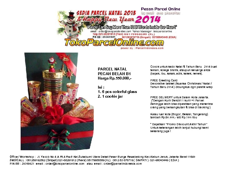 PARCEL NATAL PECAH BELAH B 1 Harga Rp. 550. 000, Isi : 1. 6 pcs colorful glass 2. 1 cookie jar Cocok untuk kado Natal & Tahun Baru 2014 buat teman, kolega bisnis, ataupun keluarga anda (bapak, ibu, kakak, adik, kakek, nenek). FREE Greeting Card Decorative basket (Nuansa Christmas / Natal / Tahun Baru 2014 ) dibungkus dgn plastik wrap FREE DELIVERY untuk Dalam Kota Jakarta. (*Dengan Kurir Sendiri 1 kurir =1 Parcel Sehingga lebih bisa dipastikan yang menerima orang yang bersangkutan & bisa di tracking ) Kalau luar kota (Bogor, Bekasi, Tangerang) tambah Rp. 50. 000, - s/d Rp. 100 ribu * Dapatkan "Promo Discount Akhir Tahun" Untuk keterangan lebih lanjut hubungi kami sekarang juga ! Office / Workshop : Jl. Yacob No 4 A Rt. 4 Rw. 8 Kel. Sukabumi Utara Dekat Pasar Bunga Rawabelong Kec. Kebun Jeruk, Jakarta Barat 11540 SMS/CALL : 081289192562 (Simpati) 021 -68291912 (Fleksi) 08179958589 (XL) 0812 83 676719 ( SIMPATI ) 021 -98043449 ( ESIA ) PIN BB : 29369921 email : order@tokoparcelonline. com atau email : order@parcelindonesia. com