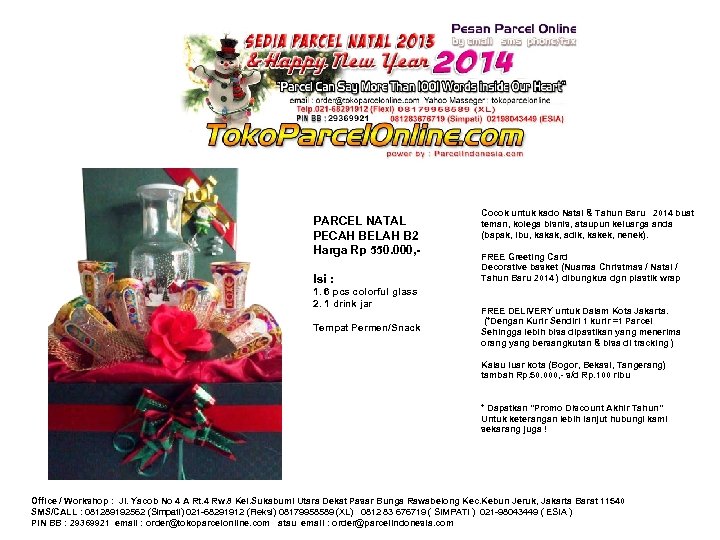 PARCEL NATAL PECAH BELAH B 2 Harga Rp 550. 000, Isi : 1. 6 pcs colorful glass 2. 1 drink jar Tempat Permen/Snack Cocok untuk kado Natal & Tahun Baru 2014 buat teman, kolega bisnis, ataupun keluarga anda (bapak, ibu, kakak, adik, kakek, nenek). FREE Greeting Card Decorative basket (Nuansa Christmas / Natal / Tahun Baru 2014 ) dibungkus dgn plastik wrap FREE DELIVERY untuk Dalam Kota Jakarta. (*Dengan Kurir Sendiri 1 kurir =1 Parcel Sehingga lebih bisa dipastikan yang menerima orang yang bersangkutan & bisa di tracking ) Kalau luar kota (Bogor, Bekasi, Tangerang) tambah Rp. 50. 000, - s/d Rp. 100 ribu * Dapatkan "Promo Discount Akhir Tahun" Untuk keterangan lebih lanjut hubungi kami sekarang juga ! Office / Workshop : Jl. Yacob No 4 A Rt. 4 Rw. 8 Kel. Sukabumi Utara Dekat Pasar Bunga Rawabelong Kec. Kebun Jeruk, Jakarta Barat 11540 SMS/CALL : 081289192562 (Simpati) 021 -68291912 (Fleksi) 08179958589 (XL) 0812 83 676719 ( SIMPATI ) 021 -98043449 ( ESIA ) PIN BB : 29369921 email : order@tokoparcelonline. com atau email : order@parcelindonesia. com