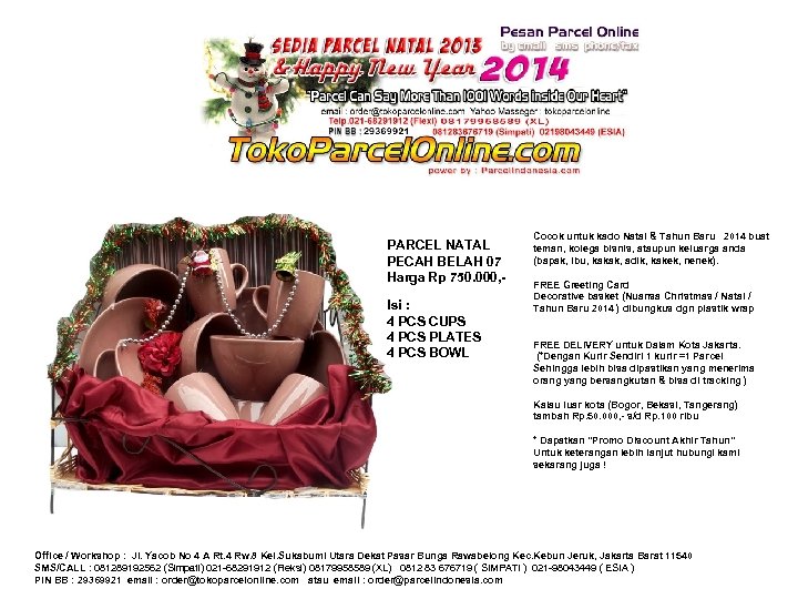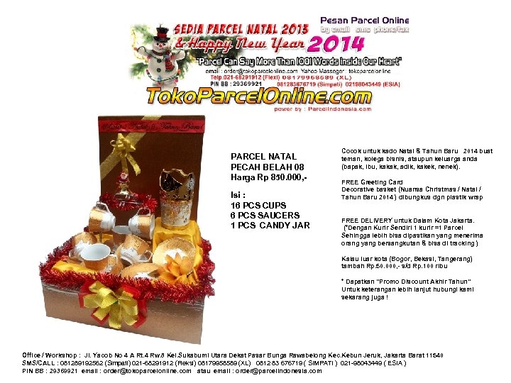 PARCEL NATAL PECAH BELAH 08 Harga Rp 850. 000, Isi : 16 PCS CUPS 6 PCS SAUCERS 1 PCS CANDY JAR Cocok untuk kado Natal & Tahun Baru 2014 buat teman, kolega bisnis, ataupun keluarga anda (bapak, ibu, kakak, adik, kakek, nenek). FREE Greeting Card Decorative basket (Nuansa Christmas / Natal / Tahun Baru 2014 ) dibungkus dgn plastik wrap FREE DELIVERY untuk Dalam Kota Jakarta. (*Dengan Kurir Sendiri 1 kurir =1 Parcel Sehingga lebih bisa dipastikan yang menerima orang yang bersangkutan & bisa di tracking ) Kalau luar kota (Bogor, Bekasi, Tangerang) tambah Rp. 50. 000, - s/d Rp. 100 ribu * Dapatkan "Promo Discount Akhir Tahun" Untuk keterangan lebih lanjut hubungi kami sekarang juga ! Office / Workshop : Jl. Yacob No 4 A Rt. 4 Rw. 8 Kel. Sukabumi Utara Dekat Pasar Bunga Rawabelong Kec. Kebun Jeruk, Jakarta Barat 11540 SMS/CALL : 081289192562 (Simpati) 021 -68291912 (Fleksi) 08179958589 (XL) 0812 83 676719 ( SIMPATI ) 021 -98043449 ( ESIA ) PIN BB : 29369921 email : order@tokoparcelonline. com atau email : order@parcelindonesia. com