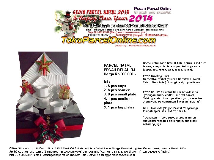 PARCEL NATAL PECAH BELAH B 4 Harga Rp 800. 000, Isi : 1. 6 pcs cups 2. 6 pcs saucer 3. 6 pcs small plate 4. 1 pcs medium plate 5. 1 pcs big platea Cocok untuk kado Natal & Tahun Baru 2014 buat teman, kolega bisnis, ataupun keluarga anda (bapak, ibu, kakak, adik, kakek, nenek). FREE Greeting Card Decorative basket (Nuansa Christmas / Natal / Tahun Baru 2014 ) dibungkus dgn plastik wrap FREE DELIVERY untuk Dalam Kota Jakarta. (*Dengan Kurir Sendiri 1 kurir =1 Parcel Sehingga lebih bisa dipastikan yang menerima orang yang bersangkutan & bisa di tracking ) Kalau luar kota (Bogor, Bekasi, Tangerang) tambah Rp. 50. 000, - s/d Rp. 100 ribu * Dapatkan "Promo Discount Akhir Tahun" Untuk keterangan lebih lanjut hubungi kami sekarang juga ! Office / Workshop : Jl. Yacob No 4 A Rt. 4 Rw. 8 Kel. Sukabumi Utara Dekat Pasar Bunga Rawabelong Kec. Kebun Jeruk, Jakarta Barat 11540 SMS/CALL : 081289192562 (Simpati) 021 -68291912 (Fleksi) 08179958589 (XL) 0812 83 676719 ( SIMPATI ) 021 -98043449 ( ESIA ) PIN BB : 29369921 email : order@tokoparcelonline. com atau email : order@parcelindonesia. com