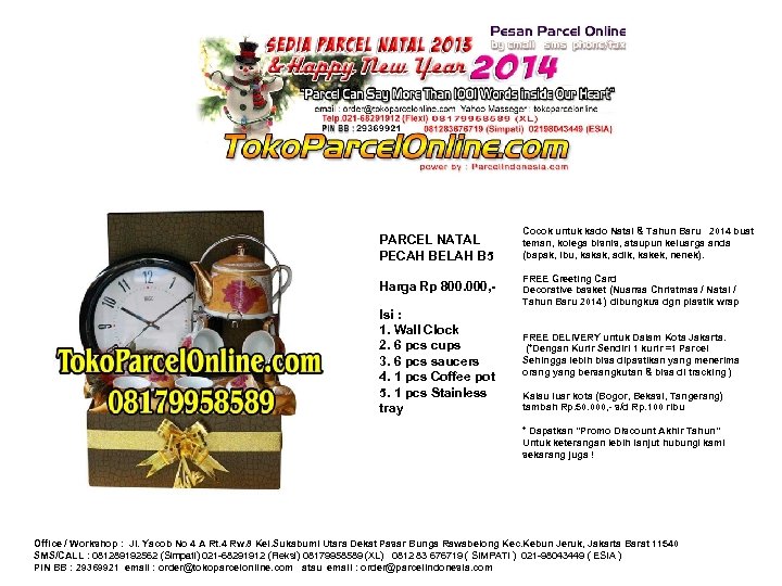 PARCEL NATAL PECAH BELAH B 5 Cocok untuk kado Natal & Tahun Baru 2014 buat teman, kolega bisnis, ataupun keluarga anda (bapak, ibu, kakak, adik, kakek, nenek). Harga Rp 800. 000, - FREE Greeting Card Decorative basket (Nuansa Christmas / Natal / Tahun Baru 2014 ) dibungkus dgn plastik wrap Isi : 1. Wall Clock 2. 6 pcs cups 3. 6 pcs saucers 4. 1 pcs Coffee pot 5. 1 pcs Stainless tray FREE DELIVERY untuk Dalam Kota Jakarta. (*Dengan Kurir Sendiri 1 kurir =1 Parcel Sehingga lebih bisa dipastikan yang menerima orang yang bersangkutan & bisa di tracking ) Kalau luar kota (Bogor, Bekasi, Tangerang) tambah Rp. 50. 000, - s/d Rp. 100 ribu * Dapatkan "Promo Discount Akhir Tahun" Untuk keterangan lebih lanjut hubungi kami sekarang juga ! Office / Workshop : Jl. Yacob No 4 A Rt. 4 Rw. 8 Kel. Sukabumi Utara Dekat Pasar Bunga Rawabelong Kec. Kebun Jeruk, Jakarta Barat 11540 SMS/CALL : 081289192562 (Simpati) 021 -68291912 (Fleksi) 08179958589 (XL) 0812 83 676719 ( SIMPATI ) 021 -98043449 ( ESIA ) PIN BB : 29369921 email : order@tokoparcelonline. com atau email : order@parcelindonesia. com