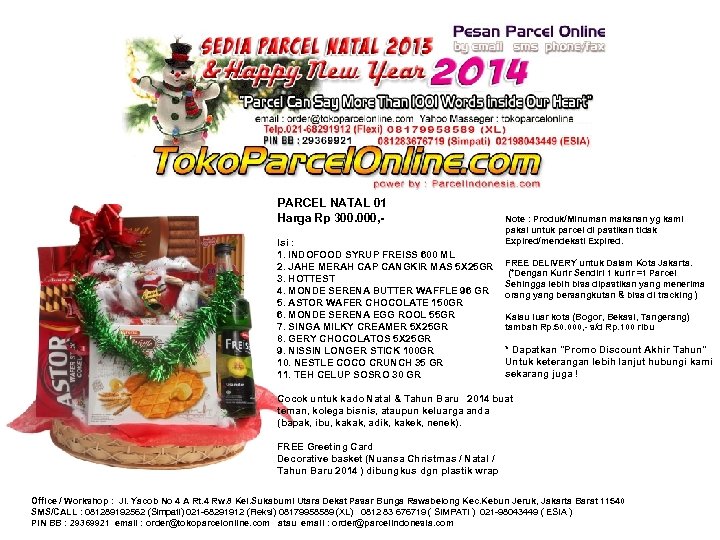 PARCEL NATAL 01 Harga Rp 300. 000, Isi : 1. INDOFOOD SYRUP FREISS 600 ML 2. JAHE MERAH CAP CANGKIR MAS 5 X 25 GR 3. HOTTEST 4. MONDE SERENA BUTTER WAFFLE 96 GR 5. ASTOR WAFER CHOCOLATE 150 GR 6. MONDE SERENA EGG ROOL 55 GR 7. SINGA MILKY CREAMER 5 X 25 GR 8. GERY CHOCOLATOS 5 X 25 GR 9. NISSIN LONGER STICK 100 GR 10. NESTLE COCO CRUNCH 35 GR 11. TEH CELUP SOSRO 30 GR Note : Produk/Minuman makanan yg kami pakai untuk parcel di pastikan tidak Expired/mendekati Expired. FREE DELIVERY untuk Dalam Kota Jakarta. (*Dengan Kurir Sendiri 1 kurir =1 Parcel Sehingga lebih bisa dipastikan yang menerima orang yang bersangkutan & bisa di tracking ) Kalau luar kota (Bogor, Bekasi, Tangerang) tambah Rp. 50. 000, - s/d Rp. 100 ribu * Dapatkan "Promo Discount Akhir Tahun" Untuk keterangan lebih lanjut hubungi kami sekarang juga ! Cocok untuk kado Natal & Tahun Baru 2014 buat teman, kolega bisnis, ataupun keluarga anda (bapak, ibu, kakak, adik, kakek, nenek). FREE Greeting Card Decorative basket (Nuansa Christmas / Natal / Tahun Baru 2014 ) dibungkus dgn plastik wrap Office / Workshop : Jl. Yacob No 4 A Rt. 4 Rw. 8 Kel. Sukabumi Utara Dekat Pasar Bunga Rawabelong Kec. Kebun Jeruk, Jakarta Barat 11540 SMS/CALL : 081289192562 (Simpati) 021 -68291912 (Fleksi) 08179958589 (XL) 0812 83 676719 ( SIMPATI ) 021 -98043449 ( ESIA ) PIN BB : 29369921 email : order@tokoparcelonline. com atau email : order@parcelindonesia. com