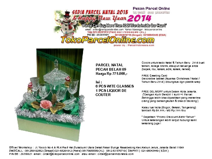 PARCEL NATAL PECAH BELAH 10 Harga Rp 775. 000, Isi : 6 PCS WHITE GLASSES 1 PCS LIQUOR DE COUTER Cocok untuk kado Natal & Tahun Baru 2014 buat teman, kolega bisnis, ataupun keluarga anda (bapak, ibu, kakak, adik, kakek, nenek). FREE Greeting Card Decorative basket (Nuansa Christmas / Natal / Tahun Baru 2014 ) dibungkus dgn plastik wrap FREE DELIVERY untuk Dalam Kota Jakarta. (*Dengan Kurir Sendiri 1 kurir =1 Parcel Sehingga lebih bisa dipastikan yang menerima orang yang bersangkutan & bisa di tracking ) Kalau luar kota (Bogor, Bekasi, Tangerang) tambah Rp. 50. 000, - s/d Rp. 100 ribu * Dapatkan "Promo Discount Akhir Tahun" Untuk keterangan lebih lanjut hubungi kami sekarang juga ! Office / Workshop : Jl. Yacob No 4 A Rt. 4 Rw. 8 Kel. Sukabumi Utara Dekat Pasar Bunga Rawabelong Kec. Kebun Jeruk, Jakarta Barat 11540 SMS/CALL : 081289192562 (Simpati) 021 -68291912 (Fleksi) 08179958589 (XL) 0812 83 676719 ( SIMPATI ) 021 -98043449 ( ESIA ) PIN BB : 29369921 email : order@tokoparcelonline. com atau email : order@parcelindonesia. com