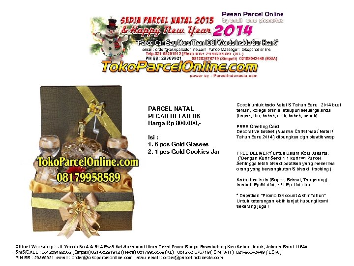 PARCEL NATAL PECAH BELAH B 6 Harga Rp 800. 000, Isi : 1. 6 pcs Gold Glasses 2. 1 pcs Gold Cookies Jar Cocok untuk kado Natal & Tahun Baru 2014 buat teman, kolega bisnis, ataupun keluarga anda (bapak, ibu, kakak, adik, kakek, nenek). FREE Greeting Card Decorative basket (Nuansa Christmas / Natal / Tahun Baru 2014 ) dibungkus dgn plastik wrap FREE DELIVERY untuk Dalam Kota Jakarta. (*Dengan Kurir Sendiri 1 kurir =1 Parcel Sehingga lebih bisa dipastikan yang menerima orang yang bersangkutan & bisa di tracking ) Kalau luar kota (Bogor, Bekasi, Tangerang) tambah Rp. 50. 000, - s/d Rp. 100 ribu * Dapatkan "Promo Discount Akhir Tahun" Untuk keterangan lebih lanjut hubungi kami sekarang juga ! Office / Workshop : Jl. Yacob No 4 A Rt. 4 Rw. 8 Kel. Sukabumi Utara Dekat Pasar Bunga Rawabelong Kec. Kebun Jeruk, Jakarta Barat 11540 SMS/CALL : 081289192562 (Simpati) 021 -68291912 (Fleksi) 08179958589 (XL) 0812 83 676719 ( SIMPATI ) 021 -98043449 ( ESIA ) PIN BB : 29369921 email : order@tokoparcelonline. com atau email : order@parcelindonesia. com