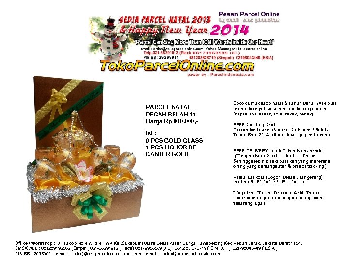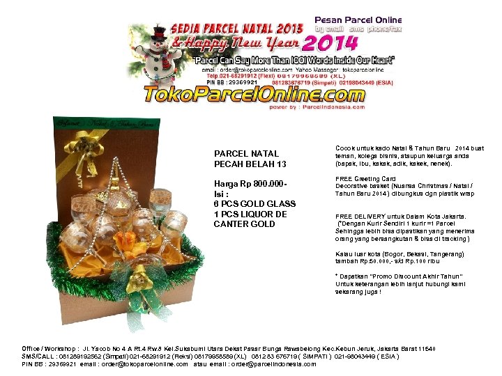PARCEL NATAL PECAH BELAH 11 Harga Rp 800. 000, Isi : 6 PCS GOLD GLASS 1 PCS LIQUOR DE CANTER GOLD Cocok untuk kado Natal & Tahun Baru 2014 buat teman, kolega bisnis, ataupun keluarga anda (bapak, ibu, kakak, adik, kakek, nenek). FREE Greeting Card Decorative basket (Nuansa Christmas / Natal / Tahun Baru 2014 ) dibungkus dgn plastik wrap FREE DELIVERY untuk Dalam Kota Jakarta. (*Dengan Kurir Sendiri 1 kurir =1 Parcel Sehingga lebih bisa dipastikan yang menerima orang yang bersangkutan & bisa di tracking ) Kalau luar kota (Bogor, Bekasi, Tangerang) tambah Rp. 50. 000, - s/d Rp. 100 ribu * Dapatkan "Promo Discount Akhir Tahun" Untuk keterangan lebih lanjut hubungi kami sekarang juga ! Office / Workshop : Jl. Yacob No 4 A Rt. 4 Rw. 8 Kel. Sukabumi Utara Dekat Pasar Bunga Rawabelong Kec. Kebun Jeruk, Jakarta Barat 11540 SMS/CALL : 081289192562 (Simpati) 021 -68291912 (Fleksi) 08179958589 (XL) 0812 83 676719 ( SIMPATI ) 021 -98043449 ( ESIA ) PIN BB : 29369921 email : order@tokoparcelonline. com atau email : order@parcelindonesia. com
