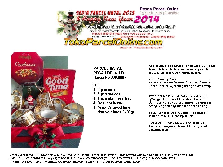 PARCEL NATAL PECAH BELAH B 7 Harga Rp 800. 000, Isi : 1. 6 pcs cups 2. 6 pcs saucer 3. 1 pcs stainless tray 4. Delfi cashews 5. Arnott’s good time double chock 3 x 80 gr Cocok untuk kado Natal & Tahun Baru 2014 buat teman, kolega bisnis, ataupun keluarga anda (bapak, ibu, kakak, adik, kakek, nenek). FREE Greeting Card Decorative basket (Nuansa Christmas / Natal / Tahun Baru 2014 ) dibungkus dgn plastik wrap FREE DELIVERY untuk Dalam Kota Jakarta. (*Dengan Kurir Sendiri 1 kurir =1 Parcel Sehingga lebih bisa dipastikan yang menerima orang yang bersangkutan & bisa di tracking ) Kalau luar kota (Bogor, Bekasi, Tangerang) tambah Rp. 50. 000, - s/d Rp. 100 ribu * Dapatkan "Promo Discount Akhir Tahun" Untuk keterangan lebih lanjut hubungi kami sekarang juga ! Office / Workshop : Jl. Yacob No 4 A Rt. 4 Rw. 8 Kel. Sukabumi Utara Dekat Pasar Bunga Rawabelong Kec. Kebun Jeruk, Jakarta Barat 11540 SMS/CALL : 081289192562 (Simpati) 021 -68291912 (Fleksi) 08179958589 (XL) 0812 83 676719 ( SIMPATI ) 021 -98043449 ( ESIA ) PIN BB : 29369921 email : order@tokoparcelonline. com atau email : order@parcelindonesia. com