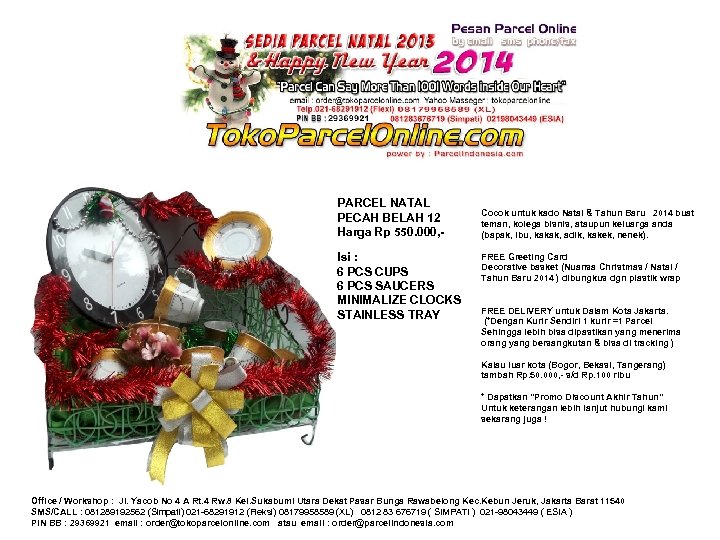 PARCEL NATAL PECAH BELAH 12 Harga Rp 550. 000, Isi : 6 PCS CUPS 6 PCS SAUCERS MINIMALIZE CLOCKS STAINLESS TRAY Cocok untuk kado Natal & Tahun Baru 2014 buat teman, kolega bisnis, ataupun keluarga anda (bapak, ibu, kakak, adik, kakek, nenek). FREE Greeting Card Decorative basket (Nuansa Christmas / Natal / Tahun Baru 2014 ) dibungkus dgn plastik wrap FREE DELIVERY untuk Dalam Kota Jakarta. (*Dengan Kurir Sendiri 1 kurir =1 Parcel Sehingga lebih bisa dipastikan yang menerima orang yang bersangkutan & bisa di tracking ) Kalau luar kota (Bogor, Bekasi, Tangerang) tambah Rp. 50. 000, - s/d Rp. 100 ribu * Dapatkan "Promo Discount Akhir Tahun" Untuk keterangan lebih lanjut hubungi kami sekarang juga ! Office / Workshop : Jl. Yacob No 4 A Rt. 4 Rw. 8 Kel. Sukabumi Utara Dekat Pasar Bunga Rawabelong Kec. Kebun Jeruk, Jakarta Barat 11540 SMS/CALL : 081289192562 (Simpati) 021 -68291912 (Fleksi) 08179958589 (XL) 0812 83 676719 ( SIMPATI ) 021 -98043449 ( ESIA ) PIN BB : 29369921 email : order@tokoparcelonline. com atau email : order@parcelindonesia. com