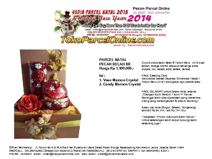 PARCEL NATAL PECAH BELAH B 8 Harga Rp 1. 500. 000, - Cocok untuk kado Natal & Tahun Baru 2014 buat teman, kolega bisnis, ataupun keluarga anda (bapak, ibu, kakak, adik, kakek, nenek). FREE Greeting Card Isi : 1. Vase Maroon Crystal Decorative basket (Nuansa Christmas / Natal / Tahun Baru 2014 ) dibungkus dgn plastik wrap 2. Candy Maroon Crystal FREE DELIVERY untuk Dalam Kota Jakarta. (*Dengan Kurir Sendiri 1 kurir =1 Parcel Sehingga lebih bisa dipastikan yang menerima orang yang bersangkutan & bisa di tracking ) Kalau luar kota (Bogor, Bekasi, Tangerang) tambah Rp. 50. 000, - s/d Rp. 100 ribu * Dapatkan "Promo Discount Akhir Tahun" Untuk keterangan lebih lanjut hubungi kami sekarang juga ! Office / Workshop : Jl. Yacob No 4 A Rt. 4 Rw. 8 Kel. Sukabumi Utara Dekat Pasar Bunga Rawabelong Kec. Kebun Jeruk, Jakarta Barat 11540 SMS/CALL : 081289192562 (Simpati) 021 -68291912 (Fleksi) 08179958589 (XL) 0812 83 676719 ( SIMPATI ) 021 -98043449 ( ESIA ) PIN BB : 29369921 email : order@tokoparcelonline. com atau email : order@parcelindonesia. com