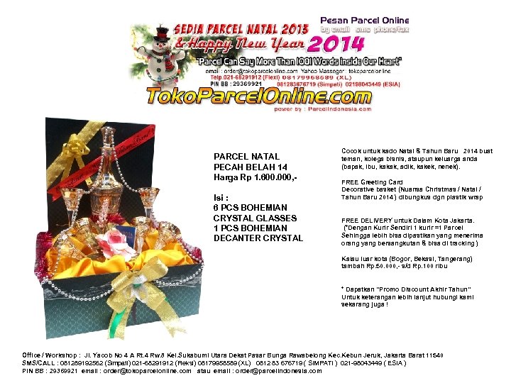 PARCEL NATAL PECAH BELAH 14 Harga Rp 1. 600. 000, Isi : 6 PCS BOHEMIAN CRYSTAL GLASSES 1 PCS BOHEMIAN DECANTER CRYSTAL Cocok untuk kado Natal & Tahun Baru 2014 buat teman, kolega bisnis, ataupun keluarga anda (bapak, ibu, kakak, adik, kakek, nenek). FREE Greeting Card Decorative basket (Nuansa Christmas / Natal / Tahun Baru 2014 ) dibungkus dgn plastik wrap FREE DELIVERY untuk Dalam Kota Jakarta. (*Dengan Kurir Sendiri 1 kurir =1 Parcel Sehingga lebih bisa dipastikan yang menerima orang yang bersangkutan & bisa di tracking ) Kalau luar kota (Bogor, Bekasi, Tangerang) tambah Rp. 50. 000, - s/d Rp. 100 ribu * Dapatkan "Promo Discount Akhir Tahun" Untuk keterangan lebih lanjut hubungi kami sekarang juga ! Office / Workshop : Jl. Yacob No 4 A Rt. 4 Rw. 8 Kel. Sukabumi Utara Dekat Pasar Bunga Rawabelong Kec. Kebun Jeruk, Jakarta Barat 11540 SMS/CALL : 081289192562 (Simpati) 021 -68291912 (Fleksi) 08179958589 (XL) 0812 83 676719 ( SIMPATI ) 021 -98043449 ( ESIA ) PIN BB : 29369921 email : order@tokoparcelonline. com atau email : order@parcelindonesia. com