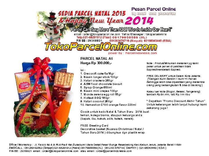PARCEL NATAL A 1 Harga Rp 300. 000, Isi : 1. Oreo soft cake 5 x 16 gr 2. Nissin longer stick 100 gr 3. Hatari crackers 260 gr 4. ASW food chocolate biscuit 5. Syrup Orange 650 ml 6. Nissin mini crepes 100 gr 7. Monde serena egg roll 55 gr 8. Hottest BBQ 160 gr 9. Hatari coconut 260 gr 10. Hemaviton C 100 orange flavor 330 ml Note : Produk/Minuman makanan yg kami pakai untuk parcel di pastikan tidak Expired/mendekati Expired. FREE DELIVERY untuk Dalam Kota Jakarta. (*Dengan Kurir Sendiri 1 kurir =1 Parcel Sehingga lebih bisa dipastikan yang menerima orang yang bersangkutan & bisa di tracking ) Kalau luar kota (Bogor, Bekasi, Tangerang) tambah Rp. 50. 000, - s/d Rp. 100 ribu * Dapatkan "Promo Discount Akhir Tahun" Untuk keterangan lebih lanjut hubungi kami sekarang juga ! Cocok untuk kado Natal & Tahun Baru 2014 buat teman, kolega bisnis, ataupun keluarga anda (bapak, ibu, kakak, adik, kakek, nenek). FREE Greeting Card Decorative basket (Nuansa Christmas / Natal / Tahun Baru 2014 ) dibungkus dgn plastik wrap Office / Workshop : Jl. Yacob No 4 A Rt. 4 Rw. 8 Kel. Sukabumi Utara Dekat Pasar Bunga Rawabelong Kec. Kebun Jeruk, Jakarta Barat 11540 SMS/CALL : 081289192562 (Simpati) 021 -68291912 (Fleksi) 08179958589 (XL) 0812 83 676719 ( SIMPATI ) 021 -98043449 ( ESIA ) PIN BB : 29369921 email : order@tokoparcelonline. com atau email : order@parcelindonesia. com