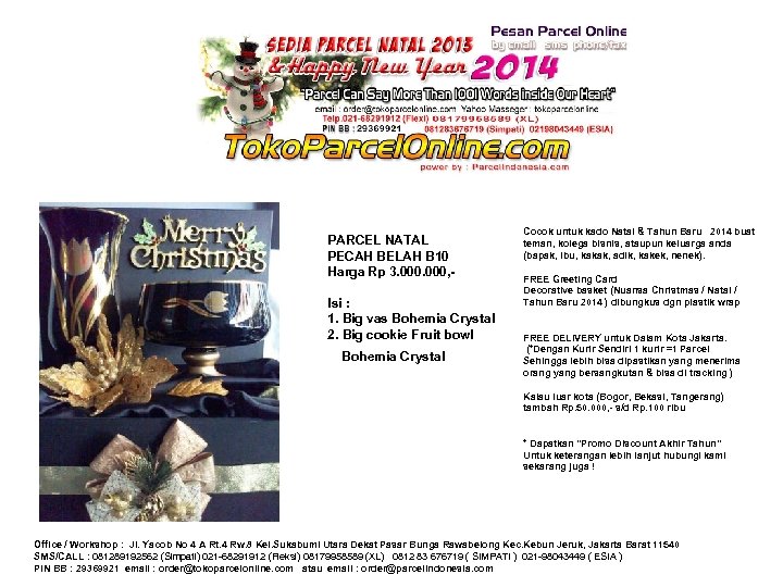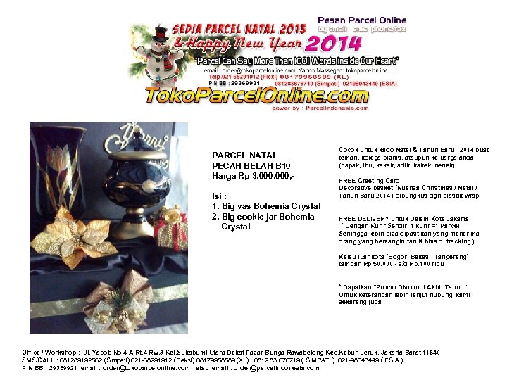PARCEL NATAL PECAH BELAH B 10 Harga Rp 3. 000, Isi : 1. Big vas Bohemia Crystal 2. Big cookie jar Bohemia Crystal Cocok untuk kado Natal & Tahun Baru 2014 buat teman, kolega bisnis, ataupun keluarga anda (bapak, ibu, kakak, adik, kakek, nenek). FREE Greeting Card Decorative basket (Nuansa Christmas / Natal / Tahun Baru 2014 ) dibungkus dgn plastik wrap FREE DELIVERY untuk Dalam Kota Jakarta. (*Dengan Kurir Sendiri 1 kurir =1 Parcel Sehingga lebih bisa dipastikan yang menerima orang yang bersangkutan & bisa di tracking ) Kalau luar kota (Bogor, Bekasi, Tangerang) tambah Rp. 50. 000, - s/d Rp. 100 ribu * Dapatkan "Promo Discount Akhir Tahun" Untuk keterangan lebih lanjut hubungi kami sekarang juga ! Office / Workshop : Jl. Yacob No 4 A Rt. 4 Rw. 8 Kel. Sukabumi Utara Dekat Pasar Bunga Rawabelong Kec. Kebun Jeruk, Jakarta Barat 11540 SMS/CALL : 081289192562 (Simpati) 021 -68291912 (Fleksi) 08179958589 (XL) 0812 83 676719 ( SIMPATI ) 021 -98043449 ( ESIA ) PIN BB : 29369921 email : order@tokoparcelonline. com atau email : order@parcelindonesia. com