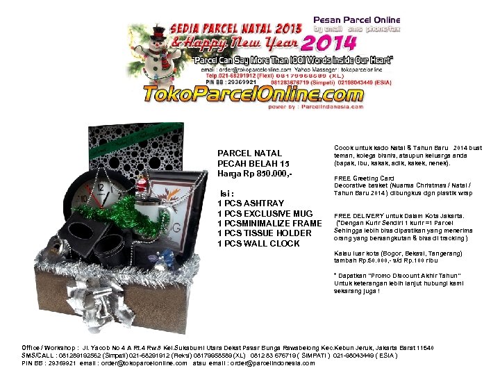 PARCEL NATAL PECAH BELAH 15 Harga Rp 850. 000, Isi : 1 PCS ASHTRAY 1 PCS EXCLUSIVE MUG 1 PCSMINIMALIZE FRAME 1 PCS TISSUE HOLDER 1 PCS WALL CLOCK Cocok untuk kado Natal & Tahun Baru 2014 buat teman, kolega bisnis, ataupun keluarga anda (bapak, ibu, kakak, adik, kakek, nenek). FREE Greeting Card Decorative basket (Nuansa Christmas / Natal / Tahun Baru 2014 ) dibungkus dgn plastik wrap FREE DELIVERY untuk Dalam Kota Jakarta. (*Dengan Kurir Sendiri 1 kurir =1 Parcel Sehingga lebih bisa dipastikan yang menerima orang yang bersangkutan & bisa di tracking ) Kalau luar kota (Bogor, Bekasi, Tangerang) tambah Rp. 50. 000, - s/d Rp. 100 ribu * Dapatkan "Promo Discount Akhir Tahun" Untuk keterangan lebih lanjut hubungi kami sekarang juga ! Office / Workshop : Jl. Yacob No 4 A Rt. 4 Rw. 8 Kel. Sukabumi Utara Dekat Pasar Bunga Rawabelong Kec. Kebun Jeruk, Jakarta Barat 11540 SMS/CALL : 081289192562 (Simpati) 021 -68291912 (Fleksi) 08179958589 (XL) 0812 83 676719 ( SIMPATI ) 021 -98043449 ( ESIA ) PIN BB : 29369921 email : order@tokoparcelonline. com atau email : order@parcelindonesia. com