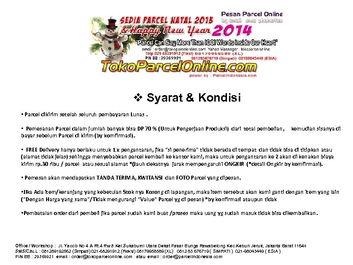 v Syarat & Kondisi • Parcel dikirim setelah seluruh pembayaran Lunas. • Pemesanan Parcel dalam jumlah banyak bisa DP 70 % (Untuk Pengerjaan Produksi) dari total pembelian, kemudian sisanya di bayar sebelum Parcel di kirim (by komfirmasi). • FREE Delivery hanya berlaku untuk 1 x pengantaran, jika “si penerima” tidak berada di tempat dan tidak bisa di titipkan atau (alamat tidak jelas) sehingga menyebabkan parcel kembali ke kantor kami, maka untuk pengantaran ke 2 akan di kenakan biaya kirim rp. 30 ribu / parcel atau sesuai alamat *(Jauh dekatnya jarak mempengaruhi ONGKIR (*detail Ongkir by komfirmasi). • Pemesan akan mendapatkan TANDA TERIMA, KWITANSI dan FOTO Parcel yang dipesan. • JIka Ada item/keranjang yang kebetulan Stok nya Kosong di lapangan, maka item tersebut akan kami ganti dengan item yang lain ("Dengan Harga yang sama"/Tidak mengurangi "Value" Parcel yg di pesan) *by konfirmasi ataupun tidak • Pembatalan order dari pembeli jika parcel sudah kami buat /proses maka uang yg sudah masuk tidak bisa dikembalikan. Office / Workshop : Jl. Yacob No 4 A Rt. 4 Rw. 8 Kel. Sukabumi Utara Dekat Pasar Bunga Rawabelong Kec. Kebun Jeruk, Jakarta Barat 11540 SMS/CALL : 081289192562 (Simpati) 021 -68291912 (Fleksi) 08179958589 (XL) 0812 83 676719 ( SIMPATI ) 021 -98043449 ( ESIA ) PIN BB : 29369921 email : order@tokoparcelonline. com atau email : order@parcelindonesia. com