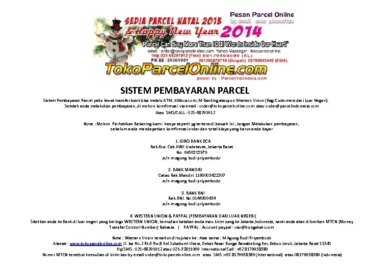 SISTEM PEMBAYARAN PARCEL Sistem Pembayaran Parcel yaitu lewat transfer bank bisa melalu ATM, klikbca. com, M Banking ataupun Western Union (Bagi Customers dari Luar Negeri). Setelah anda melakukan pembayaran, di mohon komfirmasi via email : order@tokoparcelonline. com atau order@parcelindonesia. com Atau SMS/CALL : 021 -68291912 Note : Mohon Perhatikan Rekening kami hanya seperti yg tertera di bawah ini , Jangan Melakukan pembayaran, sebelum anda mendapatkan komfirmasi order dan total biaya yang harus anda bayar 1. GIRO BANK BCA Rek. Bca. Cab. HWI Lindeteves, Jakarta Barat No. 6450212979 a/n m agung budi priyambodo 2. BANK MANDIRI Catau Rek. Mandiri 1160005422507 a/n m agung budi priyambodo 3. BANK BNI Rek. BNI. No. 0144300454 a/n m agung budi priyambodo 4. WESTERN UNION & PAYPAL (PEMBAYARAN DARI LUAR NEGERI) Silahkan anda ke Bank di luar negeri yang berlogo WESTERN UNION, kemudian katakan anda mau kirim uang ke Jakarta, Indonesia, nanti anda akan di berikan MTCN (Money Transfer Control Number) Rahasia. | PAYPAL : Account paypal : ceo@bungahati. com Note : Western Union tersebut di tujukan ke : Atas nama : M Agung Budi Priyambodo Alamat : www. tokoparcelonline. com Jl. Isa No. 2 Rt. 4 Rw. 8 Kel. Sukabumi Utara, Dekat Pasar Bunga Rawabelong Kec. Kebun Jeruk, Jakarta Barat 11540 Hp/SMS : 021 -68291912 atau 021 -32811069 International Call : +62 8179958589 Nomor MTCN tersebut kemudian di kirim kan by email order@tokoparcelonline. com atau SMS : +62 8179958589 (International) atau 08179958589 (Indonesia)