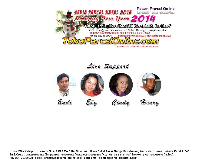 Office / Workshop : Jl. Yacob No 4 A Rt. 4 Rw. 8 Kel. Sukabumi Utara Dekat Pasar Bunga Rawabelong Kec. Kebun Jeruk, Jakarta Barat 11540 SMS/CALL : 081289192562 (Simpati) 021 -68291912 (Fleksi) 08179958589 (XL) 0812 83 676719 ( SIMPATI ) 021 -98043449 ( ESIA ) PIN BB : 29369921 email : order@tokoparcelonline. com atau email : order@parcelindonesia. com