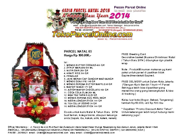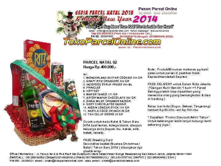 PARCEL NATAL 02 Harga Rp 400. 000, Isi : 1. WONDERLAND BUTTER COOKIES 300 GR 2. KRAFT RITZ CREAKERS 300 GR 3. INDOFOOD SYRUP FREISS 600 ML 4. PRINGLES 5. HOTTEST 6. WAFER TANGO 171 GR 7. ASTOR WAFER CHOCOLATE 150 GR 8. SINGA MILKY CREAMER 5 X 25 GR 9. GERY CHOCOLATOS 5 X 25 GR 10. NISSIN LONGER STICK 100 GR 11. NESTLE COCO CRUNCH 35 GR 12. TEH CELUP SOSRO 30 GR Cocok untuk kado Natal & Tahun Baru 2014 buat teman, kolega bisnis, ataupun keluarga anda (bapak, ibu, kakak, adik, kakek, nenek). FREE Greeting Card Decorative basket (Nuansa Christmas / Natal / Tahun Baru 2014 ) dibungkus dgn plastik wrap Note : Produk/Minuman makanan yg kami pakai untuk parcel di pastikan tidak Expired/mendekati Expired. FREE DELIVERY untuk Dalam Kota Jakarta. (*Dengan Kurir Sendiri 1 kurir =1 Parcel Sehingga lebih bisa dipastikan yang menerima orang yang bersangkutan & bisa di tracking ) Kalau luar kota (Bogor, Bekasi, Tangerang) tambah Rp. 50. 000, - s/d Rp. 100 ribu * Dapatkan "Promo Discount Akhir Tahun" Untuk keterangan lebih lanjut hubungi kami sekarang juga ! Office / Workshop : Jl. Yacob No 4 A Rt. 4 Rw. 8 Kel. Sukabumi Utara Dekat Pasar Bunga Rawabelong Kec. Kebun Jeruk, Jakarta Barat 11540 SMS/CALL : 081289192562 (Simpati) 021 -68291912 (Fleksi) 08179958589 (XL) 0812 83 676719 ( SIMPATI ) 021 -98043449 ( ESIA ) PIN BB : 29369921 email : order@tokoparcelonline. com atau email : order@parcelindonesia. com