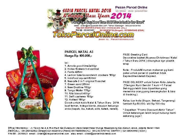 PARCEL NATAL A 3 Harga Rp 500. 000, Isi : 1. Arnots good time 3 x 80 gr 2. Hotsa Krakers hot sambal 3. Fanta 425 ml 4. Lemon baleria sandwich crackers 160 gr 5. Indofood squash 630 ml 6. Nescafe 3 in 1 original 5 sachet 7. Green sand 250 ml 8. New Ovaltine 153 gr 9. Tango Wafer 175 gr 10. Ritz biscuit 400 gr 11. Delfi cashews 150 gr 12. Hottest 160 gr Cocok untuk kado Natal & Tahun Baru 2014 buat teman, kolega bisnis, ataupun keluarga anda (bapak, ibu, kakak, adik, kakek, nenek). FREE Greeting Card Decorative basket (Nuansa Christmas / Natal / Tahun Baru 2014 ) dibungkus dgn plastik wrap Note : Produk/Minuman makanan yg kami pakai untuk parcel di pastikan tidak Expired/mendekati Expired. FREE DELIVERY untuk Dalam Kota Jakarta. (*Dengan Kurir Sendiri 1 kurir =1 Parcel Sehingga lebih bisa dipastikan yang menerima orang yang bersangkutan & bisa di tracking ) Kalau luar kota (Bogor, Bekasi, Tangerang) tambah Rp. 50. 000, - s/d Rp. 100 ribu * Dapatkan "Promo Discount Akhir Tahun" Untuk keterangan lebih lanjut hubungi kami sekarang juga ! Office / Workshop : Jl. Yacob No 4 A Rt. 4 Rw. 8 Kel. Sukabumi Utara Dekat Pasar Bunga Rawabelong Kec. Kebun Jeruk, Jakarta Barat 11540 SMS/CALL : 081289192562 (Simpati) 021 -68291912 (Fleksi) 08179958589 (XL) 0812 83 676719 ( SIMPATI ) 021 -98043449 ( ESIA ) PIN BB : 29369921 email : order@tokoparcelonline. com atau email : order@parcelindonesia. com