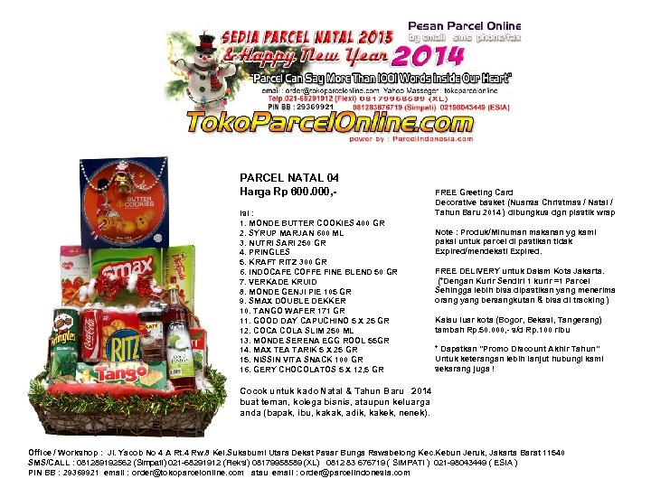 PARCEL NATAL 04 Harga Rp 600. 000, Isi : 1. MONDE BUTTER COOKIES 400 GR 2. SYRUP MARJAN 600 ML 3. NUTRI SARI 250 GR 4. PRINGLES 5. KRAFT RITZ 300 GR 6. INDOCAFE COFFE FINE BLEND 50 GR 7. VERKADE KRUID 8. MONDE GENJI PIE 105 GR 9. SMAX DOUBLE DEKKER 10. TANGO WAFER 171 GR 11. GOOD DAY CAPUCHINO 5 X 25 GR 12. COCA COLA SLIM 250 ML 13. MONDE SERENA EGG ROOL 55 GR 14. MAX TEA TARIK 5 X 25 GR 15. NISSIN VITA SNACK 100 GR 16. GERY CHOCOLATOS 5 X 12, 5 GR FREE Greeting Card Decorative basket (Nuansa Christmas / Natal / Tahun Baru 2014 ) dibungkus dgn plastik wrap Note : Produk/Minuman makanan yg kami pakai untuk parcel di pastikan tidak Expired/mendekati Expired. FREE DELIVERY untuk Dalam Kota Jakarta. (*Dengan Kurir Sendiri 1 kurir =1 Parcel Sehingga lebih bisa dipastikan yang menerima orang yang bersangkutan & bisa di tracking ) Kalau luar kota (Bogor, Bekasi, Tangerang) tambah Rp. 50. 000, - s/d Rp. 100 ribu * Dapatkan "Promo Discount Akhir Tahun" Untuk keterangan lebih lanjut hubungi kami sekarang juga ! Cocok untuk kado Natal & Tahun Baru 2014 buat teman, kolega bisnis, ataupun keluarga anda (bapak, ibu, kakak, adik, kakek, nenek). Office / Workshop : Jl. Yacob No 4 A Rt. 4 Rw. 8 Kel. Sukabumi Utara Dekat Pasar Bunga Rawabelong Kec. Kebun Jeruk, Jakarta Barat 11540 SMS/CALL : 081289192562 (Simpati) 021 -68291912 (Fleksi) 08179958589 (XL) 0812 83 676719 ( SIMPATI ) 021 -98043449 ( ESIA ) PIN BB : 29369921 email : order@tokoparcelonline. com atau email : order@parcelindonesia. com