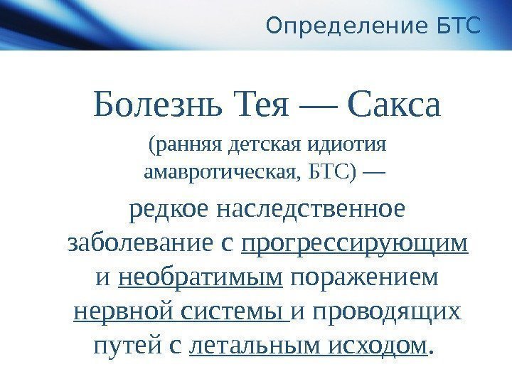 Определение БТС Болезнь Тея — Сакса (ранняя детская идиотия амавротическая, БТС) — редкое наследственное заболевание с прогрессирующим и необратимым поражением нервной системы и проводящих путей с летальным исходом.