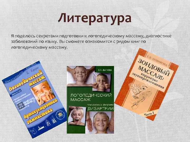 Литература Я поделюсь секретами подготовки к логопедическому массажу, диагностике заболеваний по языку. Вы сможете ознакомится с рядом книг по логопедическому массажу.
