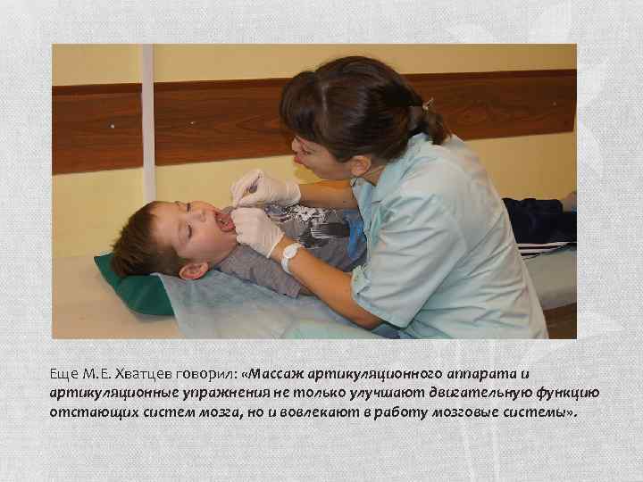 Еще М. Е. Хватцев говорил: «Массаж артикуляционного аппарата и артикуляционные упражнения не только улучшают двигательную функцию отстающих систем мозга, но и вовлекают в работу мозговые системы» .