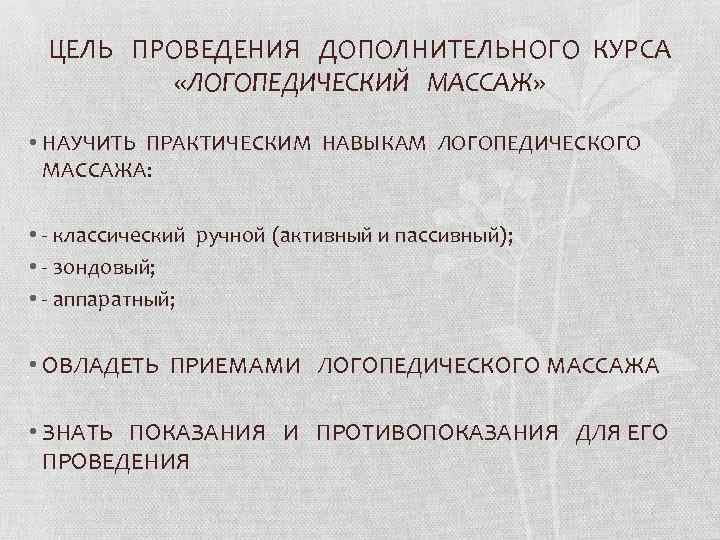 ЦЕЛЬ ПРОВЕДЕНИЯ ДОПОЛНИТЕЛЬНОГО КУРСА «ЛОГОПЕДИЧЕСКИЙ МАССАЖ» • НАУЧИТЬ ПРАКТИЧЕСКИМ НАВЫКАМ ЛОГОПЕДИЧЕСКОГО МАССАЖА: • - классический ручной (активный и пассивный); • - зондовый; • - аппаратный; • ОВЛАДЕТЬ ПРИЕМАМИ ЛОГОПЕДИЧЕСКОГО МАССАЖА • ЗНАТЬ ПОКАЗАНИЯ И ПРОТИВОПОКАЗАНИЯ ДЛЯ ЕГО ПРОВЕДЕНИЯ