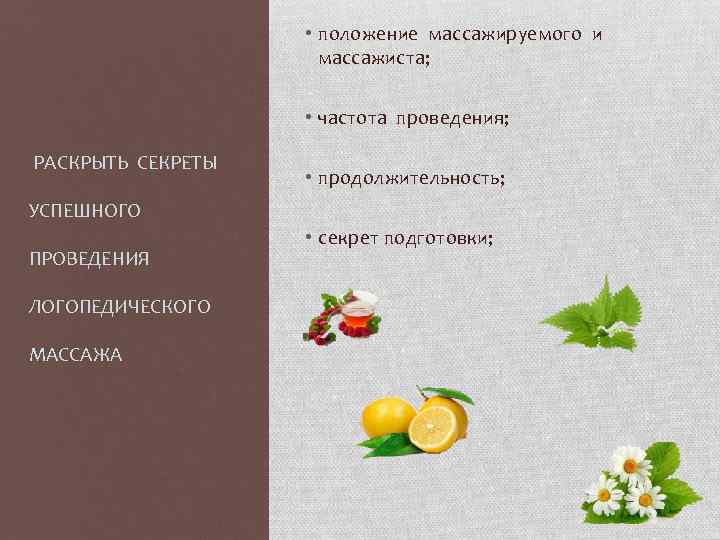 • положение массажируемого и массажиста; • частота проведения; РАСКРЫТЬ СЕКРЕТЫ • продолжительность; УСПЕШНОГО ПРОВЕДЕНИЯ ЛОГОПЕДИЧЕСКОГО МАССАЖА • секрет подготовки;