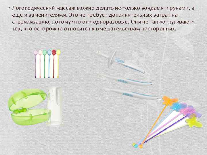 • Логопедический массаж можно делать не только зондами и руками, а еще и заменителями. Это не требует дополнительных затрат на стерилизацию, потому что они одноразовые. Они не так «отпугивают» тех, кто осторожно относится к вмешательствам посторонних.