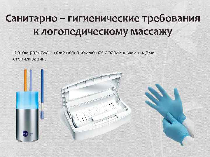 Санитарно – гигиенические требования к логопедическому массажу В этом разделе я тоже познакомлю вас с различными видами стерилизации.