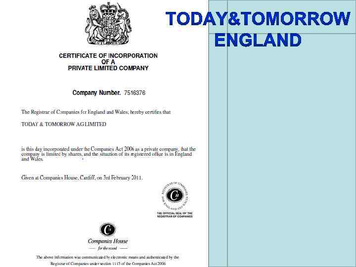 http: //www. moneyhouse. ch/u/today_tomorrow_ag_C H-170. 3. 031. 180 -9. htm § Дата регистрации: 03. 09. 2007 г. – компания Revidas Intertrade AG § 20. 01. 2011 г. – компания Today & Tomorrow AG § § Штаб-квартира: Grabenstrasse 25 6340 Baar Switzerland § Регистрационный номер: CH-170. 3. 031. 180 -9