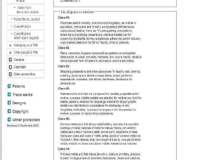 § Класс 01: Химикаты, используемые в промышленности, науке и фотографии, так же как в сельском хозяйстве, садоводстве и лесоводстве; § Класс 02 Краски, лаки; § Класс 03 Отбеливание, чистка и другие вещества для использования в прачечной; § Класс 05 : Фармацевтические и ветеринарные препараты; § Класс 06 Общие металлы и их сплавы; § Класс 14 Драгоценные металлы и их сплавы; § Класс 20 Мебель, зеркала, рамки для картин; § Класс 21 Предметы домашнего быта, кухонная посуда и контейнеры; § Класс 25 Одежда, обувь, головные уборы