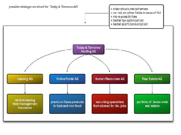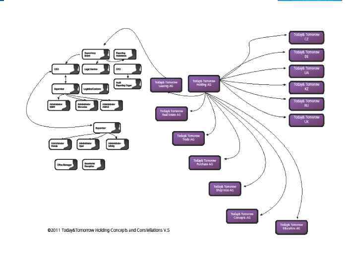 Структура компании Бенефициары Today&Tomorrow Holding AG Today&Tomorrow Leasing AG Today&Tomorrow Real Estate AG Today&Tomorrow Development AG Today&Tomorrow Beteiligungs AG Today&Tomorrow Shop’n. Go AG Today&Tomorrow Edukation AG Today&Tomorrow Trade AG Today Tomorrow (Hong Kong Einkaufs AG)
