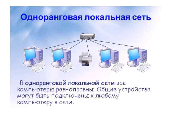 Локальные компьютерные сети • Локальная сеть объединяет компьютеры, установленные в одном помещении (например, учебный компьютерный класс, состоящий из 8 -12 компьютеров) или в одном здании (например, в здании учебного заведения могут быть объединены в локальную сеть несколько десятков компьютеров, установленных в различных предметных кабинетах). • В небольших локальных сетях все компьютеры обычно равноправны, т. е. пользователи самостоятельно решают, какие ресурсы своего компьютера (диски, каталоги, файлы) сделать общедоступными по сети. Такие сети называются одноранговыми.