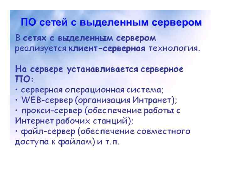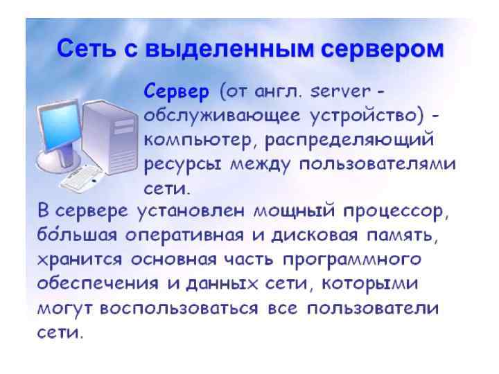 Локальные компьютерные сети • Если к локальной сети подключено более десяти компьютеров, то одноранговая сеть может оказаться недостаточно производительной. Для увеличения производительности, а также в целях обеспечения большей надежности при хранении информации в сети некоторые компьютеры специально выделяются для хранения файлов или программ-приложений. Такие компьютеры называются серверами, а локальная сеть — сетью на основе серверов.