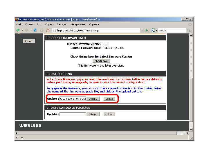 Обновление прошивки маршрутизатора • • Скачайте файл прошивки к себе на компьютер Подключите один конец патч-корда (кабель синего цвета, идущий в комплекте) к порту LAN 1 на задней панели маршрутизатора, а второй конец патч-корда в разъем сетевой карты на компьютере, который предполагается использовать для настройки маршрутизатора. Откройте Пуск → Панель управления → Сеть и подключения к Интернету → Сетевые подключения (в Vista/7: Пуск → Панель управления → Просмотр состояния сети и задач → Управление сетевыми подключениями(изменение параметров адаптера)), кликните правой кнопкой по сетевому подключению → Свойства → Протокол Интернета TCP/IP (в Vista/7: Протокол интернета версии 4) → Свойства → Получить IP-адрес автоматически. Запустите ваш браузер и зайдите на http: //192. 168. 0. 1 Появится запрос Имени пользователя и пароля. Наберите admin в поле для ввода имени, поле для ввода пароля оставьте пустым. Перейдите на вкладку Maintenance, в левой части экрана нажмите кнопку Firmware update. Нажмите кнопку обзор в окне Update settings и выберите скачанный ранее файл прошивки, затем нажмите Upload и подождите пока маршрутизатор перезагрузится.