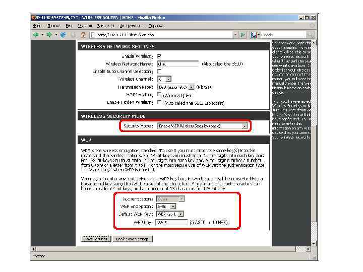 Настройка Wi. Fi • • • Перейдите на вкладку Setup, в окне Manual wireless connection options нажмите кнопку Manual wireless connection setup. ВНИМАНИЕ!!! Если вы не собираетесь использовать беспроводное подключение, в секции Wireless network settings снимите галочку Enable Wireless. Для того, чтобы кто угодно не смог подключиться к вашему маршрутизатору, необходимо настроить шифрование: В секции Wireless security mode выберите Enable WEP Wireless Security. В поле WEP Encryption выберите 64 Bit для 5 ти символьного пароля или 128 Bit для 13 ти символьного пароля. В поле WEP Key введите пароль и цифр и/или английских букв.