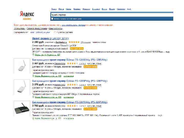 Принт-сервер • Весьма полезное, но не всегда необходимое устройство. Принт-сервер подключается к локальной сети и принтеру, затем, после несложной процедуры настройки, принтер становится доступен всем пользователям сети. При этом принтер не зависит от какого бы то ни было компьютера и его работоспособности. • Цена Print Server колеблется в районе 50 -150$, это зависит от скорости, портов (LPTUSB), и наличия дополнительных функций. Впрочем, если в вашей домашней сети будет полноценный сервер, то использование принт-сервера неоправданно, также принт-сервер можно сделать и самому: вам потребуется старый Pentium 100166, где можно установить Windows NT или старенький дистрибутив Linux в минимальной конфигурации, например, Red Hat 7. 2. В офисе, даже при отсутствии принт-сервера, все компьютеры включены в течение рабочего дня, так что можно просто подключить принтер к наиболее мощной рабочей станции.