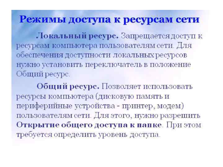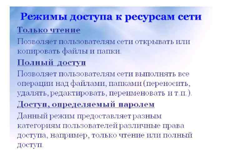 Настройка общего доступа к сетевым ресурсам • "Открыть общий доступ к папке" - позволяет пользователям сети копировать файлы, содержащиеся в данной папке в режиме "только чтение". Изменить ваши или записать свои файлы они не смогут. • "Общий Ресурс" - это сетевое имя папки, под ним она будет отображаться в ЛВС. Сетевое имя не обязательно должно совпадать с именем самой папки. • "Разрешить изменение файлов по сети" - позволяет пользователям копировать в эту папку свои файлы, а так же изменять ваши. По соображениям безопасности не стоит открывать полный доступ к системным папкам (Windows, Program Files) и содержащим важные для вас данные. Лучше всего создать специальную папку для входящих файлов (например Income) и открыть полный доступ только к ней.