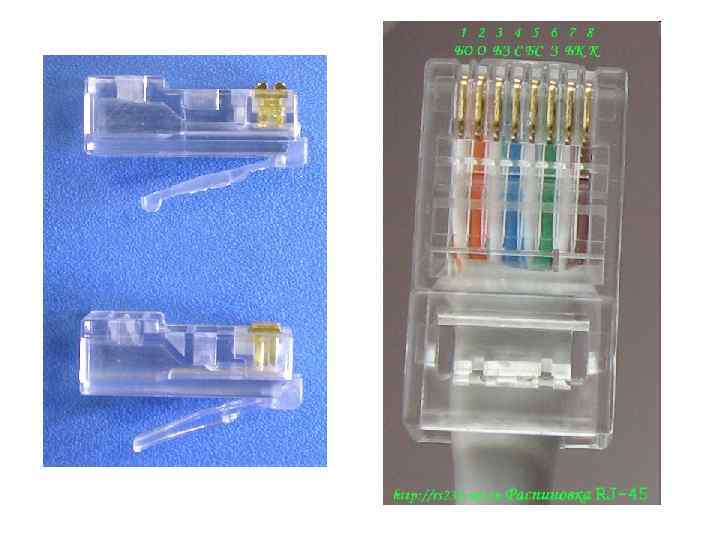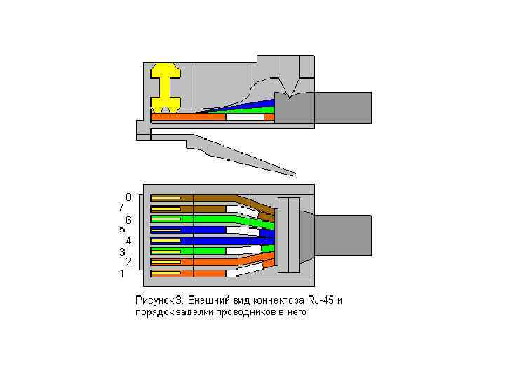 Обжим витой пары • 3. Разведите и расплетите проводки, выровняйте их в один ряд, при этом соблюдая цветовую последовательность. • 4. Обкусите проводки так, чтобы их осталось чуть больше сантиметра. • 5. Вставляйте проводники в разъем RJ-45. • 6. Проверьте, правильно ли вы расположили проводки. • 7. Убедитесь все ли провода полностью вошли в разъем и уперлись в его переднюю стенку. • 8. Поместите коннектор с установленной парой в клещи, затем плавно, но сильно произведите обжим.