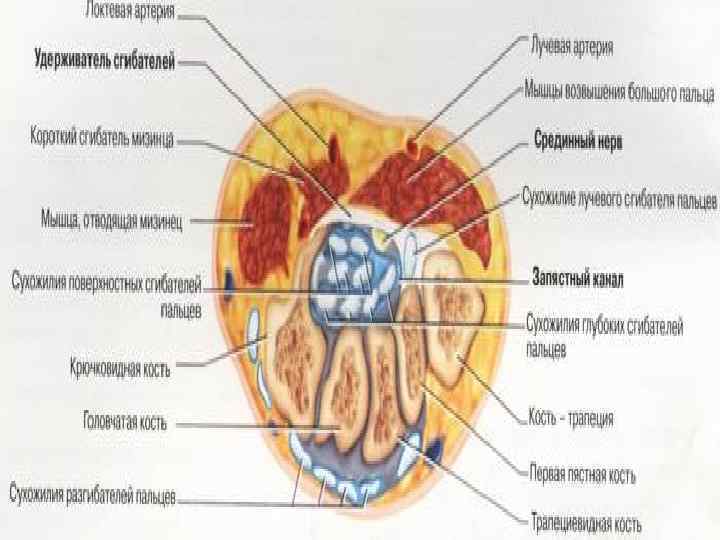 ТЕНДОВАГИНИТЫ В ОБЛАСТИ ЛАДОННОЙ ПОВЕРХНОСТИ ЗАПЯСТЬЯ Чаще обусловлены сужением запястного канала, образованного костями запястья и натянутыми над ними поперечной ладонной связкой удерживателем сгибателей пальцев и кисти. В запястном канале проходят сухожилия поверхностных и глубоких сгибателей пальцев, лучевого сгибателя кисти, длинного сгибателя I пальца (чаще расположено отдельно), а также срединный нерв. В медиальной стороне запястья, ближе к локтевому краю поперечной связки в области гороховидной кости отдельно проходит гуйонский канал, в котором находятся локтевой нерв, артерия и вена.