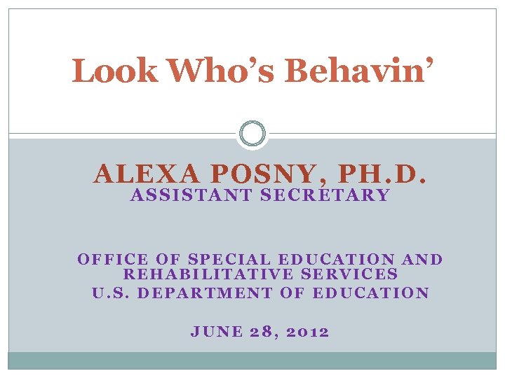 Look Who’s Behavin’ ALEXA POSNY, PH. D. ASSIS TANT SECRETAR Y OFFICE OF SPECIAL EDUCATION AND REHABILITATIVE SERVICES U. S. DEPARTMENT OF EDUCATION JUNE 28, 2012